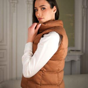 Kamizelka damska, zwana także bezrękawnikiem, wykonana z miękkiej dzianiny i wypełniona w 100% wysokiej jakości puchem gęsim. Model wyróżnia się nowoczesnym krojem z szerokimi pikami na przodzie i tyle, które nadają całości wizualnej dynamiki oraz subtelnej struktury. Klasyczna stójka zapewnia komfort i elegancję, a praktyczne zapięcie na metalowy zamek gwarantuje wygodę użytkowania.