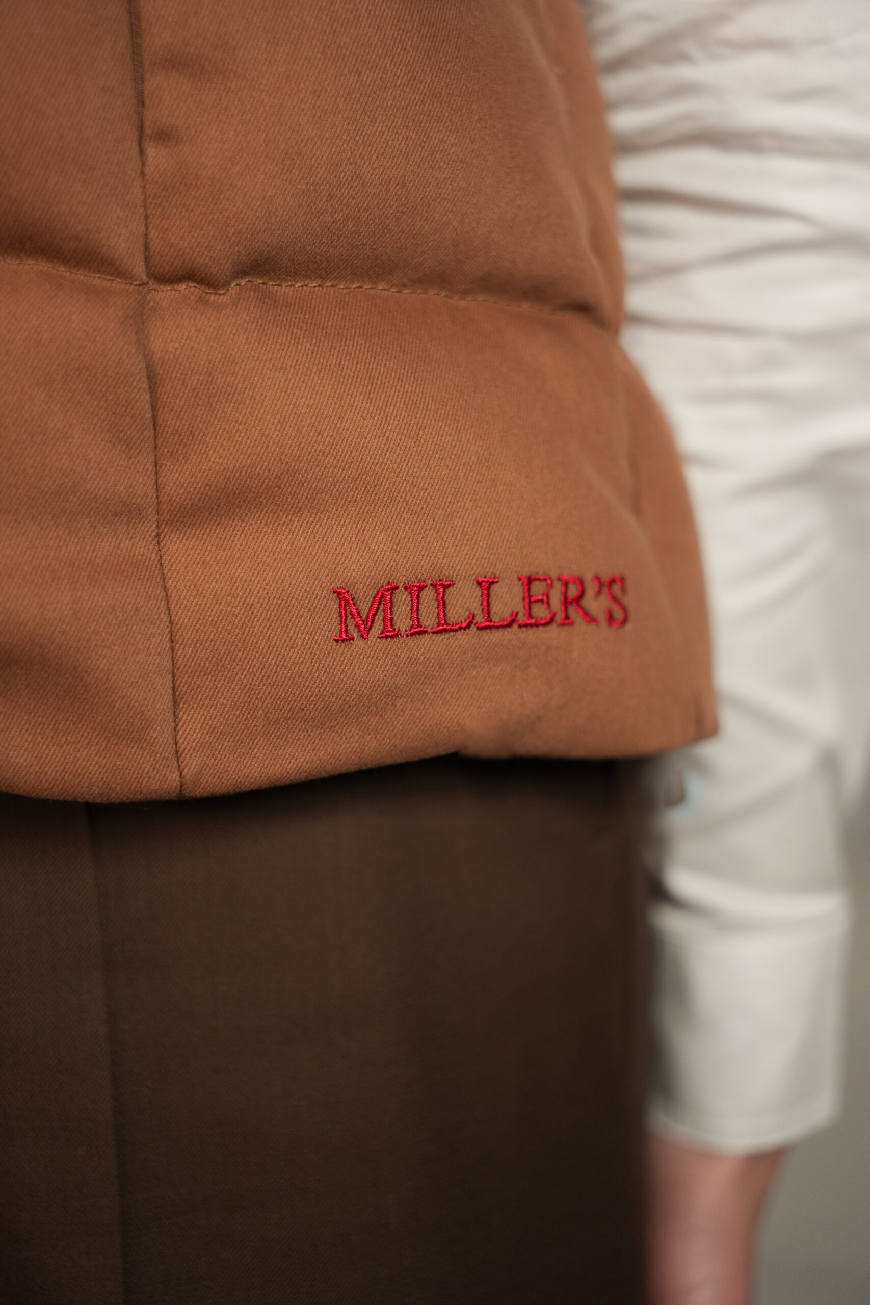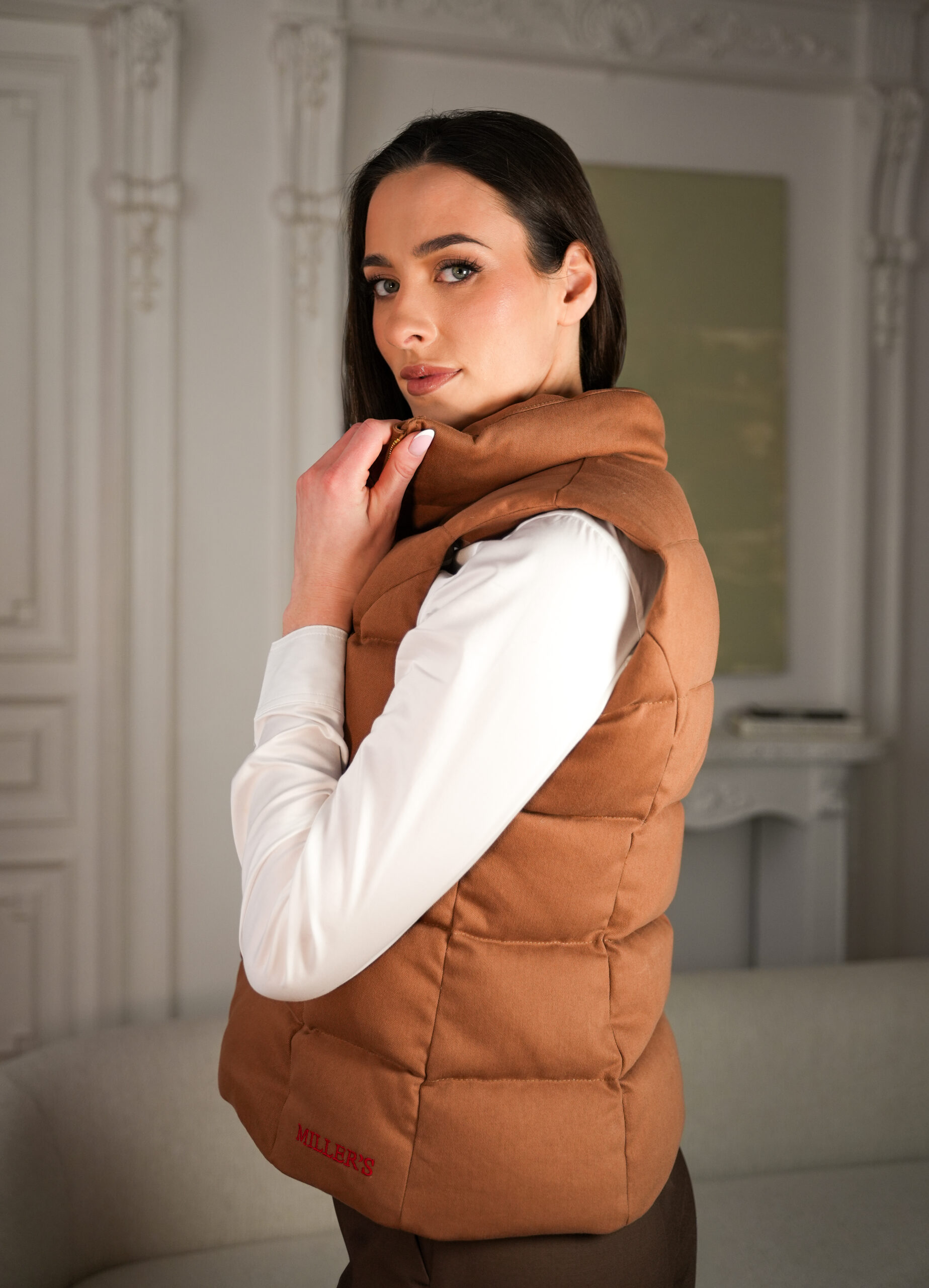 Krótka, sięgająca do linii bioder forma podkreśla talię, dodając całości kobiecego wdzięku. Dbałość o detale przejawia się w dyskretnych, ukrytych w szwach kieszeniach zapinanych na kryte zamki, które zachowują minimalistyczny i elegancki charakter. Wewnątrz kamizelka wykończona jest wiskozową podszewką, zapewniającą komfort noszenia, a dodatkowe kieszenie wewnętrzne umożliwiają praktyczne przechowywanie drobiazgów. Wykonana z wysokiej jakości bawełny w ciepłym, cynamonowym odcieniu brązu, ta kamizelka to idealny wybór na chłodniejsze dni, dodając stylowego akcentu zarówno do casualowych, jak i bardziej wyjściowych zestawów.