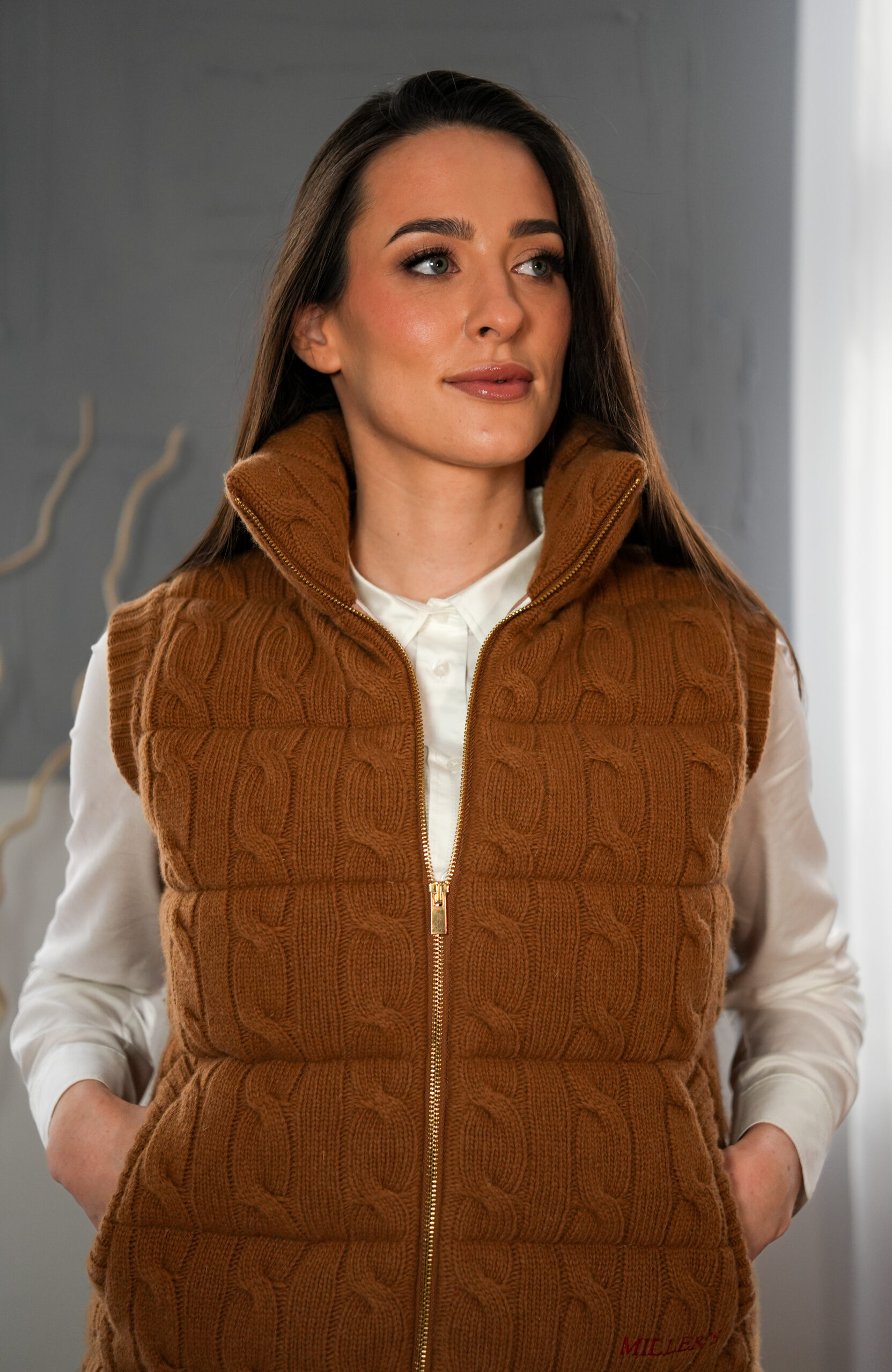 Dostępny w ciepłym, uniwersalnym odcieniu karmelu, ten dziany bezrękawnik to must-have w garderobie kobiet ceniących styl, wygodę i oryginalny design. Doskonały na casualowe wyjścia, spotkania z przyjaciółmi oraz codzienne miejskie stylizacje.